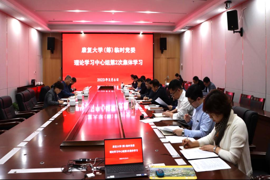 2023年3月6日下午,学校召开党委理论学习中心组(扩大)学习会议,深入学习了中国共产党第二十届中央委员会第二次全体会议公报和习近平在中央党校建校90周年庆祝大会暨2023年春季学期开学典礼上、中共中央政治局第三次集体学习时的重要讲话精神。康复大学(筹)领导小组常务副组长、临时党委副书记李欣章,领导小组成员、临时党委委员王伟、姜宏出席会议,各部门、各院(部)负责人参加会议。